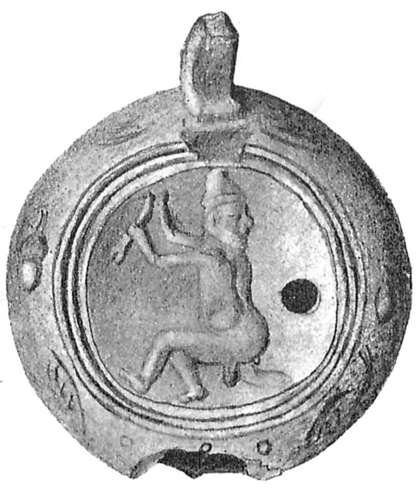 В большей части могил находилась посуда глиняная - кувшины, блюдца, тарелки, миски, вазочки и чашки - и стеклянная - бальзамарии, флаконы и др. Встречалось также много глиняных лампочек, отчасти гладких, отчасти с рельефными изображениями: Гелиоса (см. рис. № 17), мужских фигур (см. рис. № 18), барана, птиц, овцы, кабана, пегаса, оленя, виноградной кисти, звездочки; на одной лампочке находится греческая надпись XPV (см. рис. № 16), на другой латинская CASSI. Наконец во многих могилах найдены, кроме бронзовых херсонесских монет, бронзовые и серебряные монеты босфорские, царские (Котиса II и III) и автономные (пантикапейские, кесарийские, диоскурийские, синопские, амизские, амастрийские), и римские времен Нерона, Веспасиана, Септимия Севера, Каракаллы, Гелиогабала, Александра Севера, Максимина, Гордиана III, Галла Требониана, Галлиена, Клавдия II, Диоклетиана, Максимиана I, Константина Великого, Констанса и Констанция.