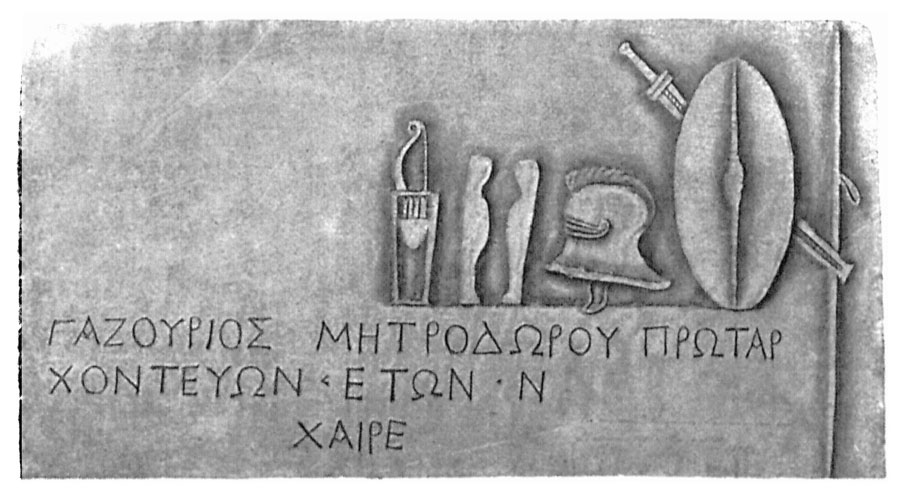 от мраморных надгробных стел с несколькими поврежденными буквами греческой надписи на одном обломке и латинской надписи на другом; надгробие