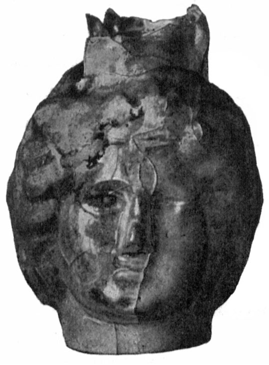 Предметы из железа. Перстни, ножи (на одном сохранились остатки кожаного футляра), ключ, крестик, принадлежности сбруи. Посуда. Сосуды чернолаковые, краснолаковые, простые глиняные, светильники, из коих некоторые украшены рельефами, стеклянные сосуды. Весьма интересен белый стеклянный флакон (мог. 1386) в виде женской головки (рис. 77а) ; на дне его снаружи оттиснута тоже женская головка (рис. рис. 77б с гипс. слепка).