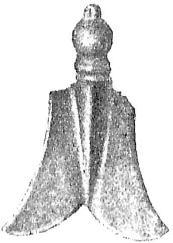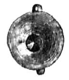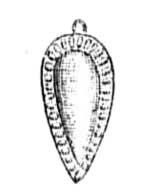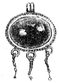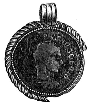 - серебряная неясная римская монета, оправленная в золото подобно первой (ушко к ней приделано так, что бюст императора очутился головой вниз и мастер предпочел ему стоящую фигуру оборотной стороны);