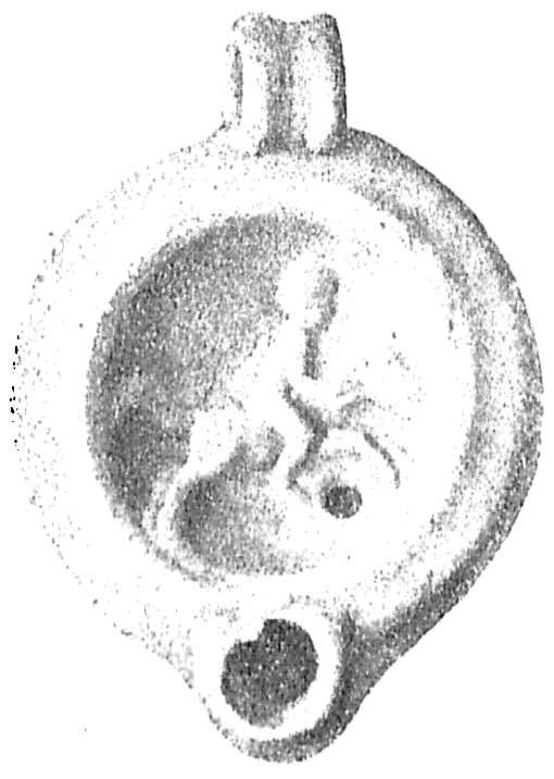 - 40 глиняных лампочек, из которых 14 гладких и 26 с рельефными изображениями: 1) кабана, 2) и 3) Эрота с виноградною кистью в каждой руке (2 экз.), 4) воина со щитом и поднятой правой рукой, 5) мужской фигуры, удерживающей коня, 6) двух Эротов, между которыми видна виноградная кисть, 7) воина с копьем, 8) и 9) трех стоящих, по-видимому, женских фигур (2 экз.), 10) стоящей женской фигуры с поднятыми руками, держащими за спиною покрывало (?), 11—14) бросающейся вправо собаки (4 экз.), 15) головы Силена (?), 16 — 17) петуха (2 экз.), 18—19) прыгающего льва (2 экз.), 20) орла, сидящего на пьедестале, 21) орла одного, 22) нагой мужской фигуры, несущей кабана, 23—24) Юпитера в виде лебедя, ласкающегося к стоящей перед ним Леде (2 экз.), 25) оленя и 26) всадника
