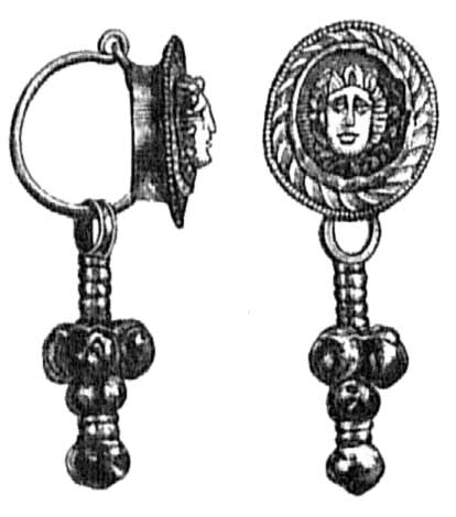 - Гробница, обложенная мелким камнем. Пара золотых серег с камеями, изображающими голову Медузы, и золотыми привесками