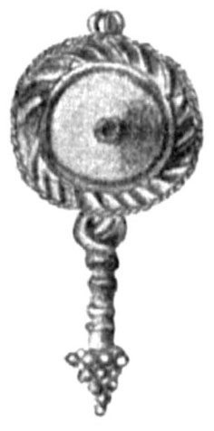 a hole; gl<ass> circle; round br<onze> mirror; 2 br<onze> buckles; 5 br<onze> brooches