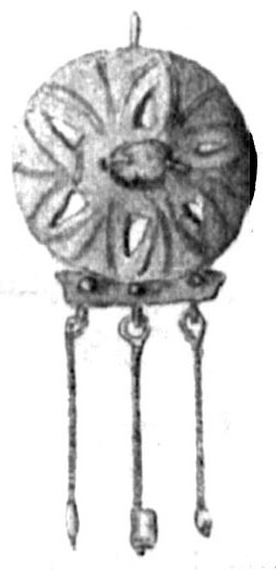 form of circles with radial carving and garnets in the middle (3 hooks on each side probably carried pendants) and gold