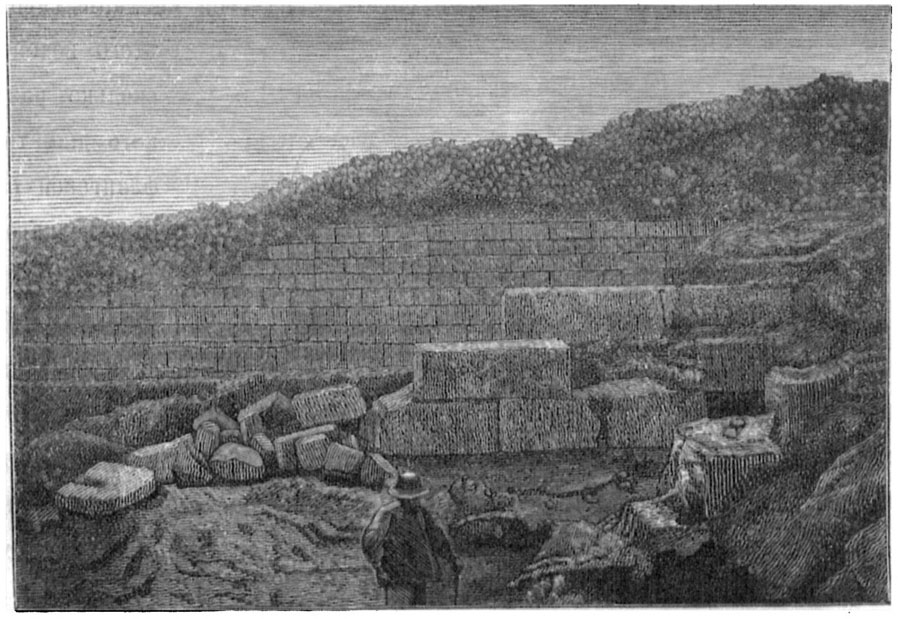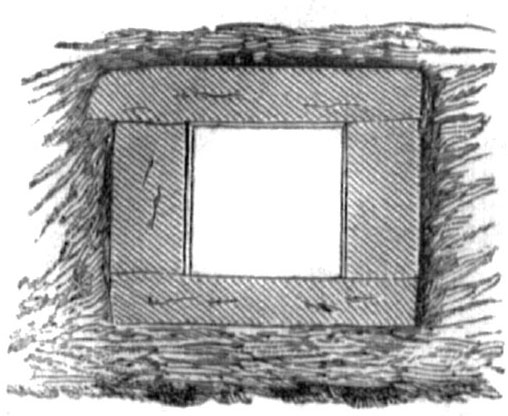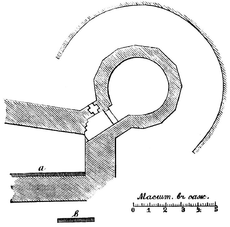 1891 г. некрополь, удалило обвал стены, причем обнаружилась ее облицовка с обеих сторон, состоящая из тесанных плит разной длины, весьма старательно пригнанных (рис. 34) . На протяжении сломанной стены, около 65 саж., открыты две четырех угольные башни, из коих одна разрушенная и одна круглая, фланговая, с узким ходом и выходом для вылазок, защищенная с наружной стороны особой круглой стеной (рис. 35) . Между этой стеной и башней, в расстоянии ½ сажени от последней, обнаружена у скалы гробница (№ 360), обставленная десятью древними черепицами, а за стеной, по обе стороны, открыто еще несколько гробниц, обставленных такими же черепицами. Это чрезвычайно важное открытие, о котором подробно будет говорено при описании некрополя, подтверждает, явившееся еще прежде, предположение, что город, разрастаясь в римскую эпоху и, конечно, по берегу моря, к западу, прошел сверху над древнегреческим некрополем, и последний до сих пор, не был открыт, так как разведки производились исключительно в отдаленных пунктах, где расположен некрополь римской эпохи. За поворотом стены, с западной стороны, обнаружены два водопровода, входившие в город каналами четырехугольной и яйцевидной формы в разрезе (рис. 36 и рис. 37) . Ближайший к южной стене водопровод в том месте, где он пересекал стену, был обложен каменными плитками, смазанными цемянкой; второй, яйцевидный, был высечен в скале и перекрыт плитой. В десяти саженях от первого канала, внутри городища, открыт сплошной трубный водопровод, на протяжении 17 саж., состоящий из 32 труб [1] 3¼" диаметра в свету, от 16" до 23" длины. Направление водопровода почти параллельно стене. Трубы в соединениях были залиты белой массой, необыкновенная прочность которой обратила на себя внимание специалистов. В двух саженях от этого водопровода к северу откопано несколько раздавленных труб более крупного диаметра и иной конструкции. Следуя от фланговой башни к северу, работы Военно-Инженерного ведомства обнаружили начало второй стены (рис. 35) , почти параллельной первой, разделяющей водопроводные каналы, из которых четырехугольный проходил между двумя стенами, а яйцевидный сзади второй стены. Последняя имела такую же облицовку по обеим сторонам, как и главная стена.