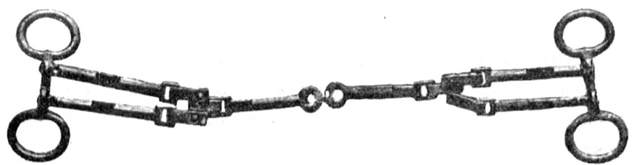 399. Тоже. В ней найдены: индикация золотая, снятая, по-видимому, с римской монеты; пластинка костяная в виде треугольника с дырочкой, неизвестного назначения и 12 бусок гагатовых, тонких и длинных. 400. Тоже. В ней найдены: чашечка глиняная одноручная; буса сердоликовая; буса янтарная; 8 бус из пасты и булавка головная бронзовая грубой работы. 401. Катакомба, подобная катакомбам №№ 343, 348, 353 и 368, с обрушившимся потолком, засыпанная землей и камнем. Длина и ширина катакомбы 3 арш. 2 вер., высота 2½ арш., в задней стене одна койка в виде ниши, 3 арш. длины и 15 верш. ширины; кости скучены. В ней найдены: листик золотой овальной формы, для покрытия рта; перстень бронзовый с вырезанным изображением льва грубой работы; бальзамарий круглодонный; браслет стеклянный, подобно найденным в некрополе без признаков соединения концов. Браслет имеет внутри 2½" в поперечнике, сделан из синего стекла с белыми и желтыми глазками сверху. Буса янтарная; 14 бус из пасты; 16 тоже из стекла; 2 пряжки бронзовые поясные; железко от ножа; 4 монеты бронзовые Херсонеса II периода (Бурачков, табл. XVI, 102-1, 111, очень плохой сохранности, 1, XVI, 117, но надписи иначе - 1 и XVI, 118-1); монета бронзовая Феодосия Великого (378-395 гг.); тоже Аркадия (395-408 гг.); монета серебряная Юлии Мамеи и монета серебряная Александра Севера (222-235 гг.). 402. Тоже. Длина 4 арш. 10 вер., ширина 4 арш., высота 2½ арш.; без коек. Расположена в 3 арш. 10 вер. от предыдущей катакомбы. Отличается грубой работой и огромным количеством человеческих костей. В ней найдены: чашечка глиняная одноручная; мисочка глиняная; 2 лампочки глиняные гладкие; перстень серебряный сломанный; пуговка бронзовая, подобная находимым в усыпальницах при храмах; 4 бусы стеклянные; монета бронзовая, очень хорошо сохранившаяся, Херсонеса I периода, с именем астинома Ироида (Бурачков, табл. XIV, 21); монета серебряная римская, неразборчивая; 5 монет бронзовых: Максимина (235-238 гг.), Констанция II (337-361 гг.), Феодосия Великого (378-395 гг.) и Аркадия (395-408 гг.) - 2. Из найденных монет видно, что катакомба эта служила местом для погребений в греческую, римскую и византийскую эпохи. 403. Гробница земляная, обложенная мелким камнем. В ней найдены: листик золотой овальной формы для покрытия рта; буса большая из пасты с белыми, желтыми и розовыми глазками. Грузило глиняное в виде усеченной пирамидки; 3 кружка стеклянные, выпуклые с одной стороны; монета бронзовая Маркианополиса с бюстами Александра Севера и Юлии Мезы (222-235 гг.); тоже неопределенная времен Геты (211-212 гг.); тоже времен Гордиана III (238-244 гг.); монета серебряная Гордиана III и монета бронзовая Херсонеса II периода, очень плохой сохранности (Бурачков, табл. XVI, 101 или 108. Приметна лишь голова Аполлона). 404. Тоже, с остовом лошади, при котором найдены удила бронзовые красивой формы и превосходной сохранности за исключением трех железных соединительных колец, разрушенных ржавчиной (см. рис. 40)
