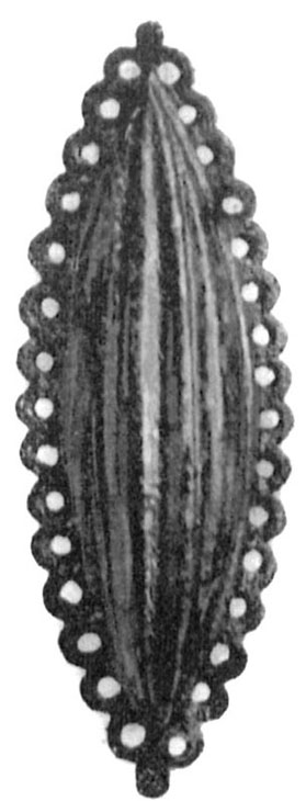 420. Тоже. В ней найдены пара запонок бронзовых в виде челнока с кружевным бордюром вокруг (рис. 42) , и пара пряжек бронзовых квадратной формы с резьбой. 421. Тоже. В ней найдены: кувшинчик глиняный одно ручный; 3 буски стеклянные и монета бронзовая Херсонеса II периода (Бурачков, табл. XVI, 109).