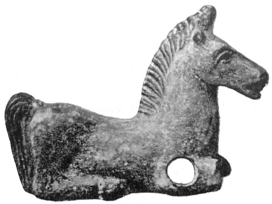 сидящего на дельфине; 2 кружка глиняные плоские, с дырочкой посередине; колечко бронзовое; кусок оленьего рога; рог