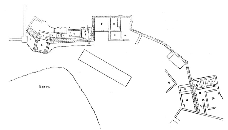 Так как постройка №2 находится в том месте берега, где расстояние его от бухты наименьшее (13 арш., несомненно, наноса, благодаря которому весь, обращенный на Ю. берег ежегодно увеличивается в ущерб ширине бухты); и так как она расположена на вершине тупого угла, образуемого древнею стеною, да снабжена 4 столбами из превосходно отесанных плит и широким (в 3 арш.) выходом внутрь городища, - то в ней, быть может, следует видеть древнюю врытую пристань, к которой могли подходить лодки. Обмеление бухты продолжается непрерывно, так же как и разрушение северного, открытого влиянию волн и ветров, берега Херсонеса, и не может подлежать сомнению, что направление древней стены, видимое на плане, более или менее соответствовало прежнему очертанию Карантинной бухты,- этого коммерческого порта древнего Херсонеса.Обмеление бухты продолжается непрерывно, так же как и разрушение северного, открытого влиянию волн и ветров, берега Херсонеса, и не может подлежать сомнению, что направление древней стены, видимое на плане, более или менее соответствовало прежнему очертанию Карантинной бухты,- этого коммерческого порта древнего Херсонеса. Направляясь к В., стена с С. стороны оказалась значительно поврежденною, причем к ней примкнуло 5 помещений (№№ 3, 4, 5, 6, 7), несомненно, складов, без окон, с низко опущенными полами, из коих два, в помещениях №№ 5 и 6, кирпичные, превосходной сохранности. Кирпичи тонкие, квадратной формы. Во время постройки этих складов и был заложен тонкой стеной на глине широкий ход, служивший сообщением города с бухтой. В помещении № 7 обнаружены остатки кирпичной печи (в) и рядом с ней большой пифос (г), 4 арш. 14 верш. в окружности, закрытый каменной плитой и закопанный в землю по самое отверстие. Далее, внутри угла, образуемого поворотом стены на С., расположена древняя башня (№ 8) с входом из города в 2 арш. ширины. Ниже пола обнаружен водоотводный канал из каменных плит, четырехугольной формы в разрезе, проходивший под стеной в б. Здесь оборонительная стена сломана ниже, чем в других местах, а сверху, через помещение башни, спускалась улица византийской эпохи, и под нею проходил второй водоотводный канал д. Как известно, под всеми улицами верхнего Херсонеса проложены водоотводные каналы, а под главной улицей даже в два ряда. В 1894 г. пришлось ограничиться раскопкой одной наружной стороны, т.е. той части берега, где в то время, когда оборонительная стена служила своему назначению, не могли существовать какие-либо постройки, так как башня (№ 8), как видно на плане, была обращена в тыл неприятелю, который отважился бы атаковать правую ломаную линию стены. После таких соображений, высказанных компетентными лицами, представляет большой интерес открытие в этом месте нескольких помещений примкнутых к оборонительной стене (№№ 9, 12, 14, 15), и даже