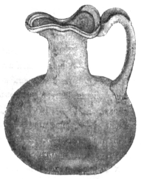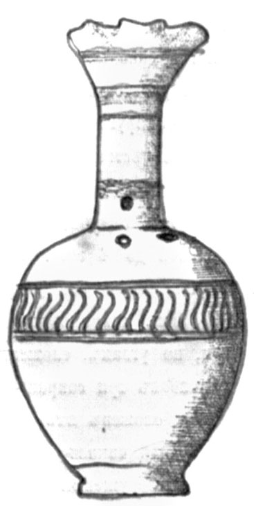 № 512. Гробница земляная, сложенная из мелкого камня. В ней найдены: фибула бронзовая сломанная; медальон бронзовый малый зубчатый; кружок костяной плоский с дырочкой; пронизь большая мозаичная и 26 бус из темной пасты. № 513. Тоже. В ней найдены: пара серег бронзовых больших, подобных найденным в гробницах №№ 485-487, 499 и 500; медальон бронзовый малый, зубчатый, и булавка головная бронзовая, грубой работы. № 514. Тоже. В ней найдены: флакон стеклянный 6" высоты (рис. 105) ; крышка бронзовая от сосуда грубой работы, в виде листика, с шарниром и с круглой ручкой сверху; брусочек точильный 5½" длины с дырочкой; 5 бусок из серой пасты и монета бронзовая Херсонеса (Бурачков, XVI, 96).