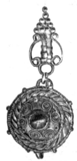 найдены: пара золотых серег превосходной сохранности, в виде диска, украшенного веночком, кружками и круглым гранатником