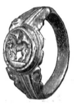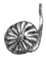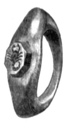 № 494. Тоже, детская. На руках ребенка находились малые бронзовые браслеты, от которых кости окрасились в зеленый цвет. Кроме браслетов найдено 16 бусок из темно-серой пасты, четырехгранной формы. № 495. Тоже. В ней найдены: перстень серебряный массивный, удлиненной формы, с сердоликом, на котором вырезан скорпион (рис. 101) , и фибула серебряная большая, поврежденная. № 496. Тоже. В ней найдены: чашечка глиняная одноручная; 5 кусочков серы, находившиеся внутри чашечки, и 9 бусок из желтого стекла, соединенные по три вместе. № 497. Тоже. В ней найдены: кувшинчик глиняный одноручный; 2 пряжки железные и 4 бусы из стекла.
