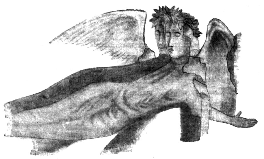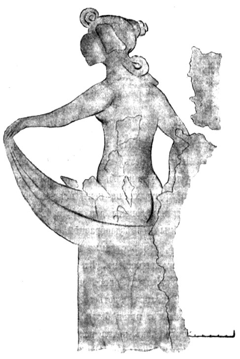 № 511. Катакомба, расположенная в нескольких саженях от круглой фланговой башни (точное расстояние определить невозможно, так как башня срыта для сооружения батареи). Катакомба имеет внутри следующие размеры: ширина от С. к Ю. - 10'.10", длина от З. к В. - 12'.4", высота от подошвы до штукатурки потолка 5'.5". Против входа, 2'.2" ширины и 1'.10" высоты, вырубленного под потолком, в задней стене высечена глубокая ниша, обычного в херсонесских катакомбах типа, 6'.3" длины, 3'.5" высоты и 3'.6" глубины; такие же ниши-койки выдолблены и в двух боковых от входа стены: в правой 7' длины, 1'.7" высоты и 1'.6" глубины и в левой 6'.3" длины, 2'1" высоты и 2'1" глубины. Стены и потолок катакомбы были отштукатурены и расписаны фресками, которые уничтожены частью сыростью и обвалились вместе с штукатуркой, частию - грабителями, которые, разграбив эту единственную в Херсонесе катакомбу с живописью, оббили во многих местах штукатурку острым орудием. Те куски фресок, которые уцелели, а именно по обеим сторонам входа, потеряли от сырости свой первоначальный цвет и стали бледными и едва приметными. Ни посуды, ни монет, ни даже костей внутри катакомбы не найдено; мелкий камень сложен в нишах и в С. углу, а просеянная земля скучена посередине катакомбы, против входа. Следы фресок сохранились: по обеим сторонам входа на передней стене; на правой боковой стене между нишей и Ю. углом и снизу ниши; в С. углу ниши левой боковой стены, снизу ниши и между нишей и С. углом. С правой стороны входа изображена женщина, повернувшаяся спиной, обнаженная почти до колен (рис. 103) . Левая рука грациозно придерживает приподнятый край одежды, правая опущена, слегка согнута и удерживает драпировку с другой стороны. Волосы собраны узлами, лицо и спина сильно повреждены ударами острого орудия. Высота фигуры - около 1½ арш.; краска - светлая мумия, причем фон бледный, а очертания темнее. С левой стороны входа изображены две обнаженные человеческие фигуры с крыльями и венками на голове, лежащие рядом, с наклоненными вниз ногами (рис. 104) . Краска - светлая мумия, причем фон бледный, а очертания темнее. Листья венка и ветви, разбросанные по телу, писаны мокрою кистью без контуров. Оба писанные рисунка сделаны умело, но небрежно. На правой стене между углом и