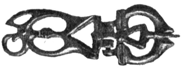 № 528. Тоже. В ней при жженом остове найдена лишь одна бронзовая поясная пряжка ажурной работы (рис. 107). № 529. Тоже. В ней найдены: чашечка глиняная одноручная с кусочком серы; пряжка поясная бронзовая и бронзовая фибула (рис. 108).