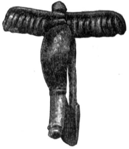 Сбруя: Бубенчик бронзовый превосходной сохранности (рис. 77). Церковные вещи: Половина бронзового энколпиона 2¼ х 1¼" с рельефным изображением Распятого Спасителя. Работа грубая. Крест бронзовый, 1¾ х 1", грубой работы, с ушком (рис. 78). . Крестик бронзовый, 1 х ¾", хорошей работы, с ушком. Тоже, сломанный, с розеткой посередине и с шариками по концам, без ушка. Тоже из пестрого мрамора, 3/16 х 4/16", сломанный. 20 пуговок бронзовых в виде бубенчиков. Курильница глиняная, наподобие цветочного горшка, с 4 дырочками снизу и 12 вокруг. Можно думать, что это крышка для бронзового кадила, подобного найденному в помещении №18. Принадлежности нарядов и туалета: Перстень бронзовый, грубой работы. 24 стеклышка круглые и овальные из перстней и медальонов. 296 обломков от стеклянных браслетов. 2 обломка от стеклянных перстней. 2 привески в виде бронзовых мечей. 7 бус из сердолика. 18 бус из разноцветного стекла. 2 бусы из разноцветной пасты. Пластинка серебряная квадратная, 1¾ х 1¾, сломанная, со следами резьбы, украшенная по углам гранатами, а спереди головой сокола, глаз которого, судя по пустому гнезду, состоял также из граната. Из гвоздиков, с помощью которых пластинка эта прикреплялась, быть может, к поясу, уцелел только один. 2 пряжки бронзовые поясные грубой работы. Пуговка костяная круглая с ушком. Грифон бронзовый 2" высоты с поднятыми крыльями, на одной толстой лапе; снизу ее находится выступ в 3/16", с помощью которого грифон, по-видимому, прикреплялся к углу ларчика и служил последнему ножкой. Пластинка костяная квадратная, с грубо вырезанным изображением орла, повернувшего голову назад, от ларчика. 2 кусочка резных костяных украшений от ларчиков. Строительные части храмов и зданий: Капитель мраморная малая, резаная. Сверху по четырем углам проделаны углубления овальной формы. 4 куска от мраморного карниза 11" ширины. Общая длина всех кусков 14". Кусок мраморного карниза 10" ширины с крестом и листьями аканта. Обломок от мраморной двери с вырезанным орнаментом в виде крестов разной формы. 5 малых обломков от мраморных плит. 3 обломка от тонких мраморных плит: белой с черными пятнами, темно-зеленой с светло-зелеными пятнами и серо-красной. 2 большие обломка от круглых мраморных колонн. Кусок белой мраморной колонки граненой 10" длины и 5" в диаметре. Кусок колонки из розового (Балаклавского) мрамора 10" в диаметре. 4688 кусочков смальты разноцветной и с позолотой, выброшенные на берег морем (из базилики, раскопанной в 1853 г. графом А. С. Уваровым). 4 куска от оконных стекол. 6 кусков цемянки (необыкновенно прочной штукатурки, состоящей из извести и толченого кирпича). Невыясненного назначения: Кружок плоский глиняный глазурованный зеленого цвета с дырочкой. 2 кружка плоские глиняные с дырочками. Пластинка бронзовая, 2 2/8 х 1 х ¼", с плоским, овальной формы, возвышением, на котором вырезан вглубь орнамент. Наконечник глиняный с сквозным отверстием и с широким загнутым носиком, подобным клюву попугая. Кольцо костяное точеное, подобное кольцам, ныне употребляемым для салфеток. Эти кольца часто находят в гробницах римской эпохи. Наконечник железный остроконечный, 6" длины. Материал для изделий: Кусок пемзы. 2 куска смолы (вар). Кости животных и раковины: 20 бивней кабанов. Челюсть кабана с бивнем. Рог быка. 2 рога домашней козы. Череп дельфина (найден на глубине 2-х арш.). Кость от ноги петуха с шпор