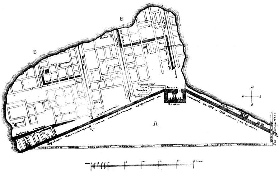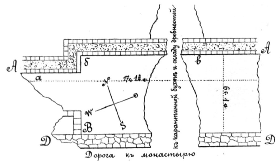 Так как в 1893 г. при сооружении батарей у южной оборонительной стены, после удаления обвала, с обеих сторон стены обнаружилась превосходная облицовка из тесанных и старательно пригнанных плит, то можно было ожидать, что такая же облицовка окажется и на остальных участках главной городской стены под теми же обвалами, благодаря которым она избегла разрушения, тогда как остававшиеся наружу облицовочные плиты были употреблены на постройку казарм, карантина, окружающей его стены и инженерной пристани.