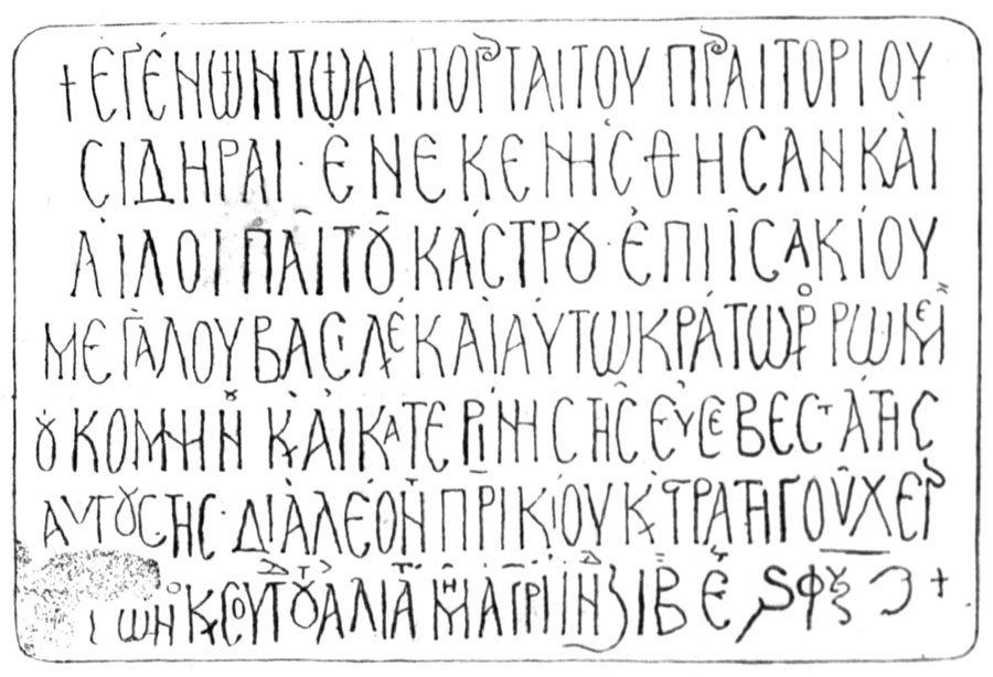 Здесь, вследствие сооружения Военно-Инженерным Ведомством новой линии батарей по направлению к Стрелецкой бухте и окончания прошлогодних, археологические раскопки, лишенные возможности подвигаться впереди крепостных работ, которые производились поспешно, с применением рельсового пути и вагонеток для земляных насыпей, должны были ограничиваться лишь поверхностным расследованием важнейших пунктов этой части городища и главным образом выяснением вопросов относительно городских ворот и оборонительного рва впереди западной стены, так как у южной стены, сооруженной на гребне значительной возвышенности, служившей, как выяснили раскопки 1891-1893 гг., обширною некрополью - рва не оказалось. Вследствие заявленного администрацией Херсонесского монастыря намерения засадить виноградником участок земли, расположенный с южной стороны нового храма, у подножия высокой насыпи (см. план на рис. 224, лит. Б) , постепенно образовавшейся с 1861 г. во время планировки площади и постройки собора, местность эта в отчетном году была расследована, за исключением треугольника (см. там же, лит. А) , образуемого древнею оборонительною и современною монастырскою стенами, который перекопан плантажным способом, т.е. перекидыванием земли на 1½ - 2 арш. в глубину. Так как местность эта расположена вне оборонительной стены и здесь могли встретиться только лачуги позднейшего времени (что доказали раскопки 1894 г.), то доследований на этой полосе не производилось, о чем просил и настоятель монастыря, по хозяйственным соображениям. Как видно на плане, древняя береговая оборонительная стена, часть которой открыта в 1892-1894 гг., вновь обнаружилась на расследованном участке, образуя тупой угол с башнею внутри [1] и c упирающимися в современную монастырскую ограду сторонами в 26 саж. 2¼ арш. и 41 саж. ¾ арш. длины. С южной стороны башня оказалась сильно поврежденною, и потому нельзя было определить, был ли с этой стороны выход и где именно, хотя внутреннее расположение ее говорит в пользу существования выхода. Впереди башни, с наружной стороны стены, найден большой кусок мраморного карниза грубой отделки, на нижней ровной стороне которого вырезана следующая греческая семистрочная надпись времен Исаака Комнина (рис. 225) , 6567-го года от сотворения мира или 1059-го г. после Р. Х. (см. исследование академика В. В. Латышева в №17 "Материалов по археологии России", стр. 83-86).