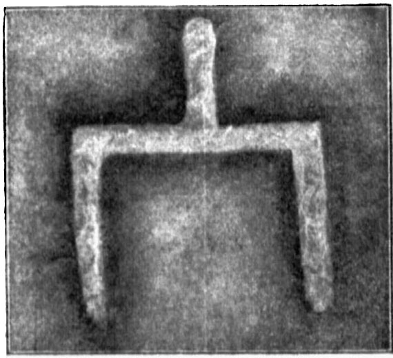 куски мрамор. половой мозаики и тонких мрамор. разноцветных плит; кусок кам. карниза с рельеф. изображениями креста и обвивающей его виноградной лозы с кистями; 6 бронз. рыболов. крючков; 2 бронз. иглы для вязания сетей; множество глин. грузил (в виде усеченных пирамидок, цилиндрических, шарообразных и четырехгранных с 2 дырочками по концам, соединенными желобком) и 7 грузил в виде свинцовых колец; обломок нижней части мрамор. статуи; часть мрамор. руки; золотой детский перстень с бирюзой в гнезде; серебр. перстень в 5 гнездах которого, расположенных кресто образно, находились круглые выпуклые стекла синего цвета (из них уцелели большое посередине и 2 малых по сторонам); 2 бронз. перстня (один с неразборчивым изображением, другой гладкий); бронз. кольцо, служившее в тоже время ключом; 7 стеклышек из перстней; бронз. привеска в виде кирки; 5 бронз. привесок в виде мечей; бронз. серьга с бронз. привеской; множество поломанных стекл. браслетов; стекл. кольцо; 2 бронз. поясные пряжки; 25 бус (4 сердолик., 1 халцедон., 2 янтар., 2 из разноцв. пасты, 14 стекл.); костяная треугольная пластинка от ларчика, с рельефным изображением какого-то зверя (рис. 239) ;