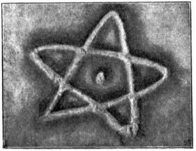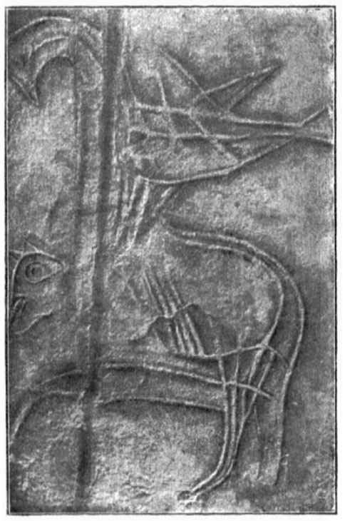 В 13 саж. и ½ арш. от этих усыпальниц к зап. начинается ряд помещений, по расположению и устройству совершенно сходных с помещениями, открытыми у той же стены в 1894 г. (см. Отчет Археол. Ком. за 1894 г., стр. 54-55). В этих магазинах, по-видимому, зернохранилищах, также по 1 двери с сев. и по 3 стены однохарактерной кладки на глине; 4-ую южную составляет большая оборонительная стена в 3 арш. толщины. В 2-х ближайших помещениях были зарыты в земле: в первом - 6, во втором - 2 пифоса, из которых один был закрыт круглой плитой. Целыми остались только 4 пифоса; на одном из них нацарапано множество греческих надписей византийской эпохи и грубые изображения креста и человеческой головы. В 4-м помещении обнаружены остатки каменной лестницы наподобие нынешних винтовых, с уцелевшими 6 ступеньками. К сев. от оборонит. стены, вверх по уклону, обнаружены, на пространстве около 1.100 кв. саж., три улицы с водостоками из каменных плит; проулок, в котором лежали в куче 50 глин. грузил (в виде цилиндриков) и 140 больших бронз. рыболовных крючков; 4 цистерны квадратной формы, оштукатуренные цемянкой; 1 пифос (раздавленный); 90 жилых помещений и складов и 2 кирпичные печи. В некоторых местах сохранились, благодаря своим солидным размерам, остатки стен нижнего города. Стены эти не от зданий, так как они одинаковой толщины с оборонительною стеною и сложены из больших, иногда громадных плит. В верхнем наслоении первой с В. улицы найдены 2 разбитые глиняные, глазурованные миски восточного происхождения. На одной из них (8½" в поперечнике) внутри, на бледно-зеленом фоне, вытиснуто изображение всадника, в полосатой одежде, с соколом на левой руке и с арабскою надписью на рукавах. Спереди и между ногами лошади изображены еще 4 птицы (рис. 228) . Другая миска (8" в поперечнике) ярко-зеленого цвета с вытиснутыми темно-коричневыми узорами восточного характера (рис. 229 и рис. 230)