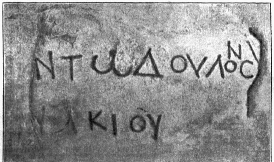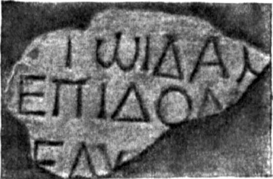 городища (рис. 244) . Главный интерес ее заключается в открытии значительного участка древней оборонит. стены (в 2¾ арш. толщины), сложенной на извести из больших, отесанных с обеих сторон, камней, с 2 подпорными стенками такой же кладки и такой же толщины (а-а). Так как последние сохранились лишь на протяжении 7 арш., остальная же часть их обрушилась вместе с берегом, то весьма вероятно, что впереди уцелевшей стены и параллельно ей шла еще другая стена контр-эскарпа, подобная описанной в предыдущей главе. Принимая во внимание значительную толщину стены, возможно допустить, что отвесный и, благодаря обрушившимся скалам, неприступный в настоящее время, берег прежде, в эпоху сооружений стены был более отлогий, и потому в некоторых пунктах доступный для неприятеля: иначе невозможно объяснить необходимость устройства целой системы оборонительных стен, в 2¾ арш. толщины, на отвесной скале возвышающейся над морем на 3 саж. Интересны еще остатки двух, расположенных рядом, круглых построек (б-б), в 4½ арш. в диаметре, с цементированными внутри стенами. Узкие двери в 14 верш. симметрично расположены с сев.-вост. стороны. Такая же постройка была открыта на этом же берегу в 1891 г. с проведенным к ней узким, вырубленным в скале, каналом. Во время раскопок здесь найдены следующие древности: обломок от мраморной плиты, с трехстрочною греческою надписью (рис. 245) ;