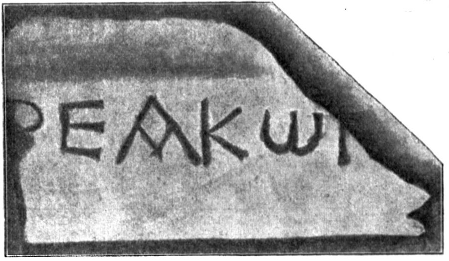 городища найдены: 3 амфорные ручки с греч. клеймами; обломок черепицы с надписью внутри клейма: