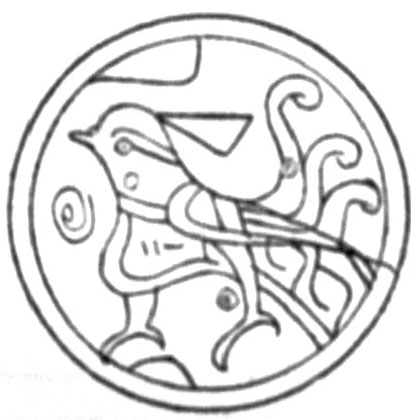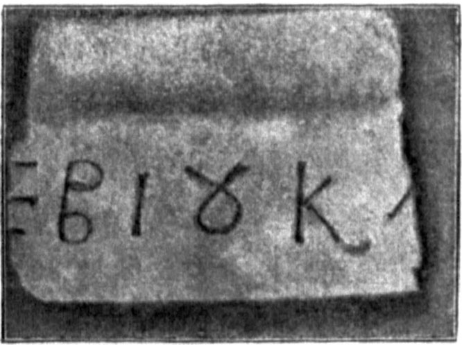 Кроме вышеназванных древностей на расследованном участке южного склона городища найдены: кусок мраморной колонки с частью греческой надписи (рис. 233) ; 2 куска мрамор. карниза, также с остатками греческих надписей (рис. 234 и рис. 235) [5]; кусок каменной плиты, с 3 крупными латинскими буквами SKO; амфорная ручка с грубым изображением зайца; 2 глин. лампочки (одна с рельефным изображением розетки, другая гладкая); чернолаковая вазочка; черепки стекл. и черно лаковой глин. посуды; 4 глин. одноручных кувшинчика; часть сосуда (?) из зеленого стекла с рельефным изображением щита и обозначением, римскими цифрами, 1322 года (рис. 236) , "относящаяся, по-видимому, к эпохе пребывания Генуэзцев в Крыму; дно глин. глазуров. мисочки желтого цвета, с вдавленной византийской монограммой; 2 глазур. мисочки, из которых одна желтого цвета, другая зеленого цвета с выдавленным на ней изображением птицы (рис. 237) ; куски глазур. блюда с рельефным изображением задних ног какого-то большого зверя и помещенного между ними детеныша с длинными ушами;