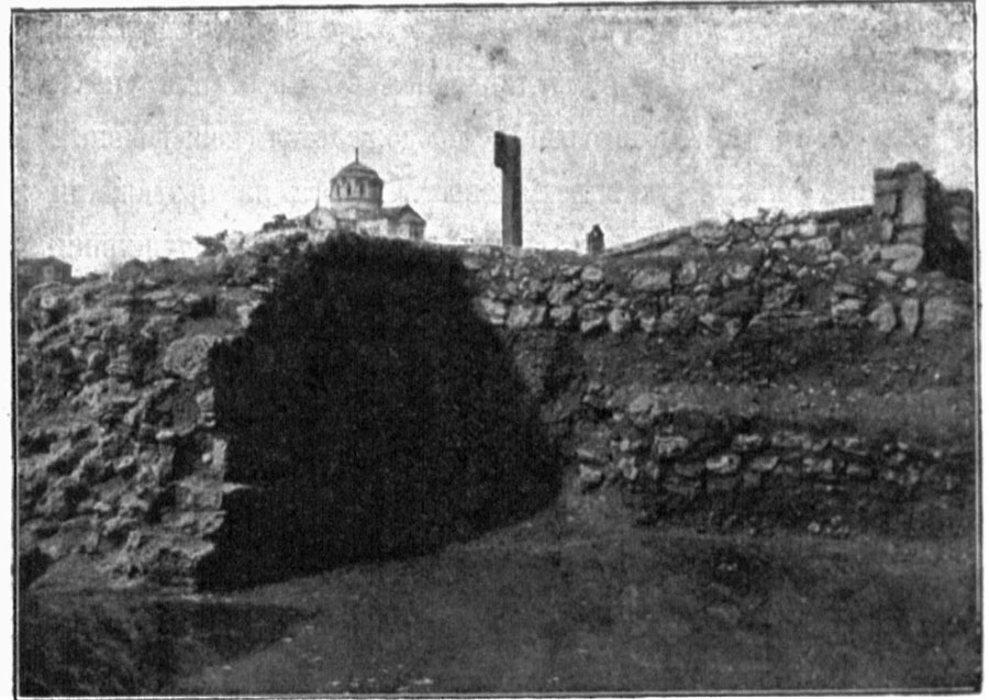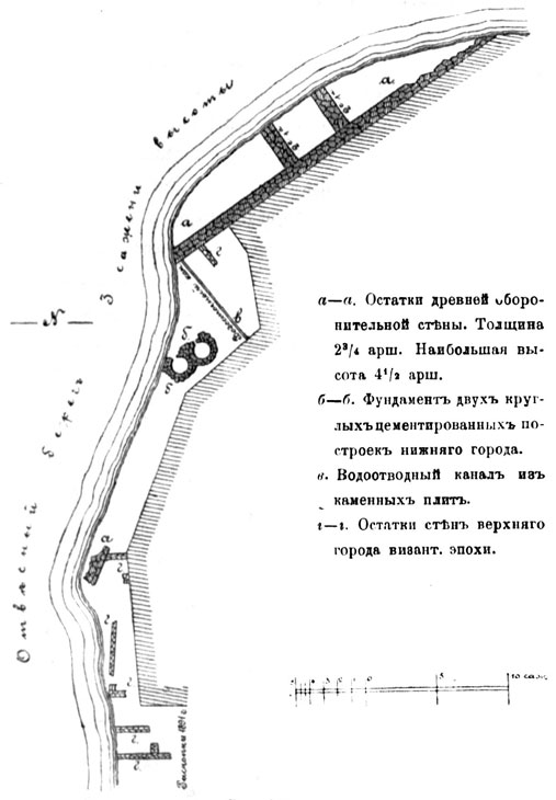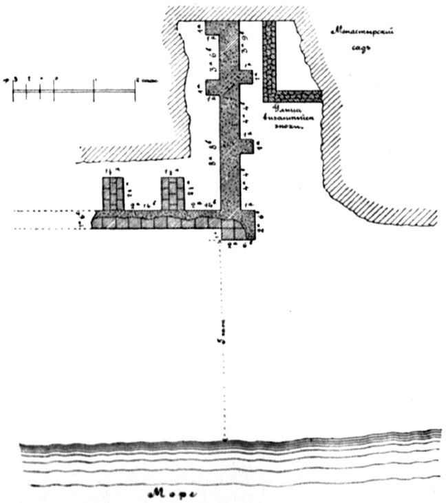Незначительные раскопки, произведенные в 1895 г. по соседству с монастырской купальней, обнаружили, наконец, остатки построек древнего города в виде стены (в 1 арш. 6 верш. толщ.) с пилястрами, расположенными с обеих сторон ее (рис. 250) . Стена оказалась сильно разрушенною, так как в этом месте улица визант. города, обнаруженная раскопками 1890 и 1891 гг., сворачивает под прямым углом на Ю.-В. и проходит поверх древней стены, сломанной до фундамента. Сев. участок этой стены сохранился лучше и от нее уцелел нижний ряд кладки из больших тесаных плит. По берегу, на В., заметны местами следы этой же стены, которая в вост. оконечности городища проходила, быть может, по крутому берегу и обрушилась в море.