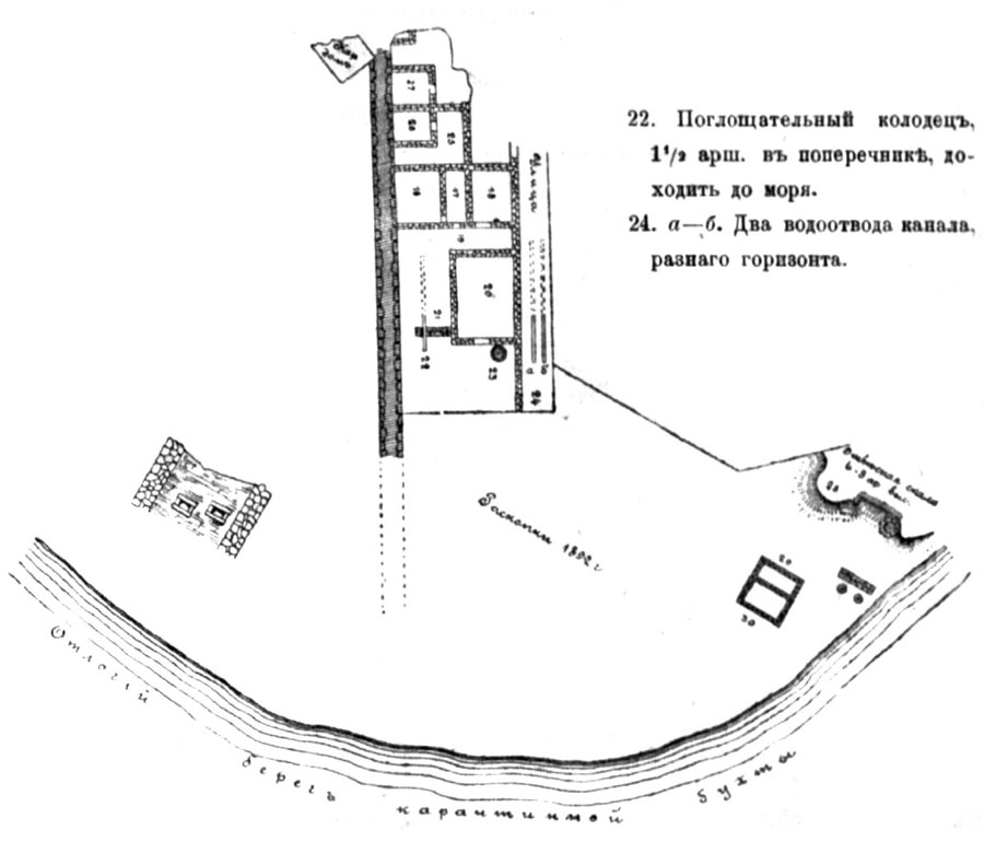 Для расследования берегового пространства между оборонительною стеною и карантинною бухтою, на самой широкой полосе в 34 саж. были выкопаны 2 колодца (один на 10 саж. от стены и 24 саж. от воды, другой в 22 саж. от стены и 12 саж. от воды). В 1-м сверху найдено 6 человеч. остовов, лежавших в беспорядке, а ниже, в слое черепков простой глиняной посуды, устричной скорлупы, костей и разных отбросов, бронз. монета Дионисополя (с бюстами Сераписа и Гордиана III); наконец, на глубине 2½ арш., появилась морская вода. Во 2-м колодце сверху также оказались 2 челов. остова, слой битой посуды и отбросов и, на глубине 1¾ арш., морская вода. Песок не обнаружен ни в колодцах, ни на берегу бухты у самой воды, где наслоение состоит из глиняных черепков, устричной скорлупы и мелких камней [4].