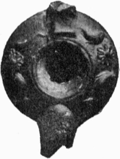 - Такая же гробница с жженым остовом, на глубине 1¼ аршина. Здесь найдены сильно поврежденные огнем: 2 терракотовые пьедестала в виде малых жертвенников (5" высоты); 5 стеклянных бальзамариев, из которых 2 сплюснуты от действия огня; костяная точеная коробочка (разломанная); 4 глиняные лампочки, из которых 2 гладкие, а 2 с рельефным изображением кентавра, вооруженного палицей.