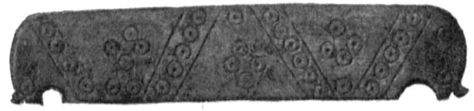 , на мизинце. Отсюда и до самого изголовья, с обеих сторон, были разбросаны 17 круглых зол. пришивных бляшек, с вытисненным