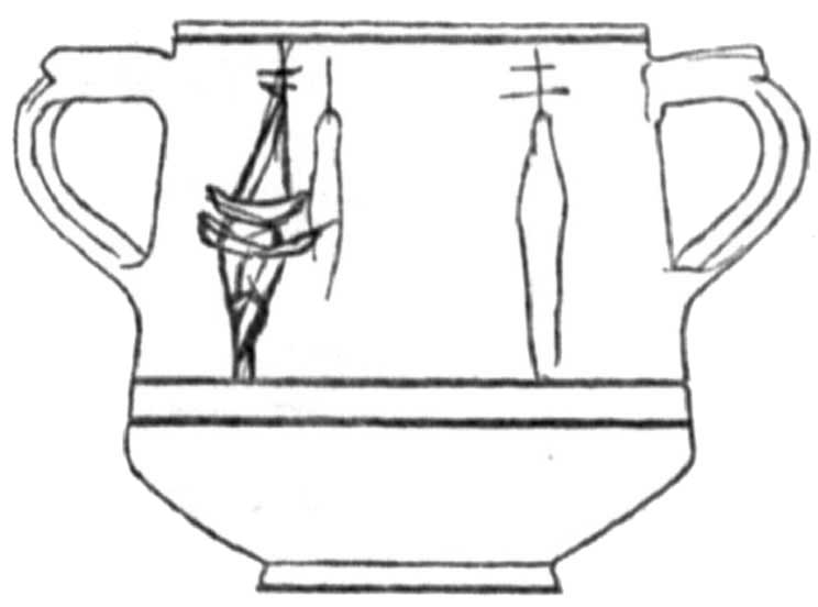 одноручных чашечек; двуручная чашечка с грубо нацарапанными с боку изображениями на одной стороне двух башен, увенчанных