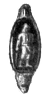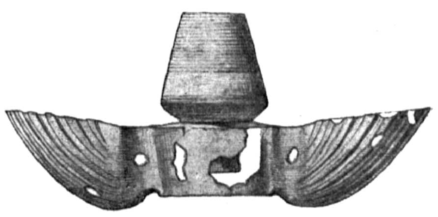 - Такая же гробница. В ней найдены узкогорлый стекл. плоскодонный бальзамарий; глин. одноручный кувшин, горло которого оканчивается розеткой; привеска в виде зубчатого бронз. медальона, и 6 бус из пасты (1 длинная черная с желтыми полосками, 2 рубчатые круглые зеленые и 3 цилиндрической формы, красные).