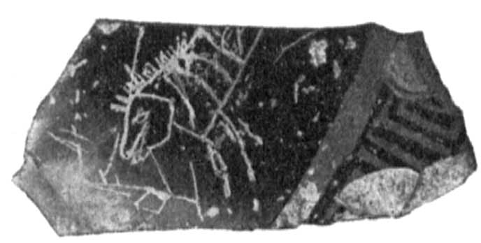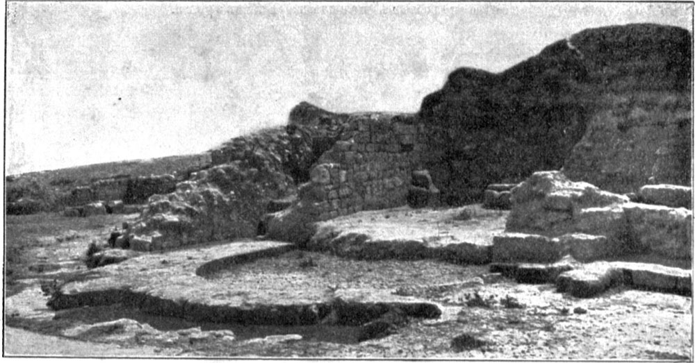 В 5 торговых помещениях, расположенных рядом, были подвалы в 2,15 м высотою. Двери из верхних помещений выходили прямо на узкую улицу, а в уровень с основанием дверей лежали деревянные половые балки (от них в земле сохранились обуглившиеся куски и в стенах ясные следы, где были впущены концы). Стены верхних помещений уцелели лишь на высоте 0,7 м. Подвалы, не имеющие дверей, сообщались, по-видимому, с верхними помещениями посредством люков и лестниц. Большое помещение д, стены которого не параллельны стенам остальных помещений, сохранилось только наполовину, а смежное помещение г составлено двумя стенами и скалой, отвесно обрубленной в виде полукружия. Водосточный канал а, прочно сложенный из каменных плит на извести и относящийся к древнейшему городу, круто спускается под оборонительную стену к бухте [2] . С южной стороны он соединяется с другим, от которого сохранилась незначительная часть, составляющая начало водостока, открытого в 1894 г. и показанного с правой стороны плана на рис. 208 (см. отчет за 1894 г.). Из двух пифосов б и в сохранился только один средней величины, яйцевидной формы. Во время раскопок здесь найдены следующие древности: