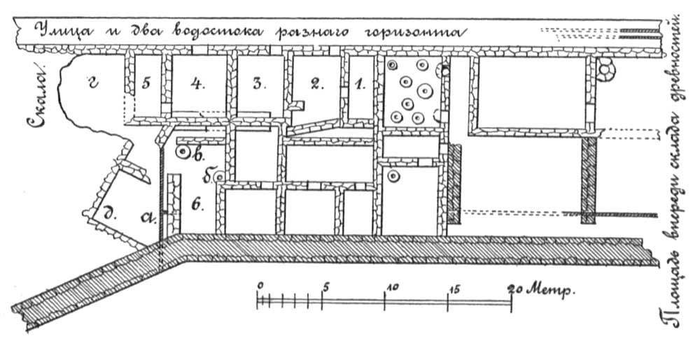 В 1897 г. раскопка продолжалась к С. от оборонительной стены, по направлению к большой базилике, открытой Крузе в 1827 г. и доследованной в 1891 г. (см. отчет Археол. Ком. за 1891 г.), между береговой оборонительной стеной и улицей византийской эпохи (рис. 208) на запад от поздних построек, открытых здесь в 1894 г. (см. отчет за 1894 г., рис. 71). При этом обнаружены: 6 торговых складов (№№ 1-6); часть большой постройки (д); помещение возле материковой скалы (г); водосточный канал (а) и 2 пифоса (б и в).