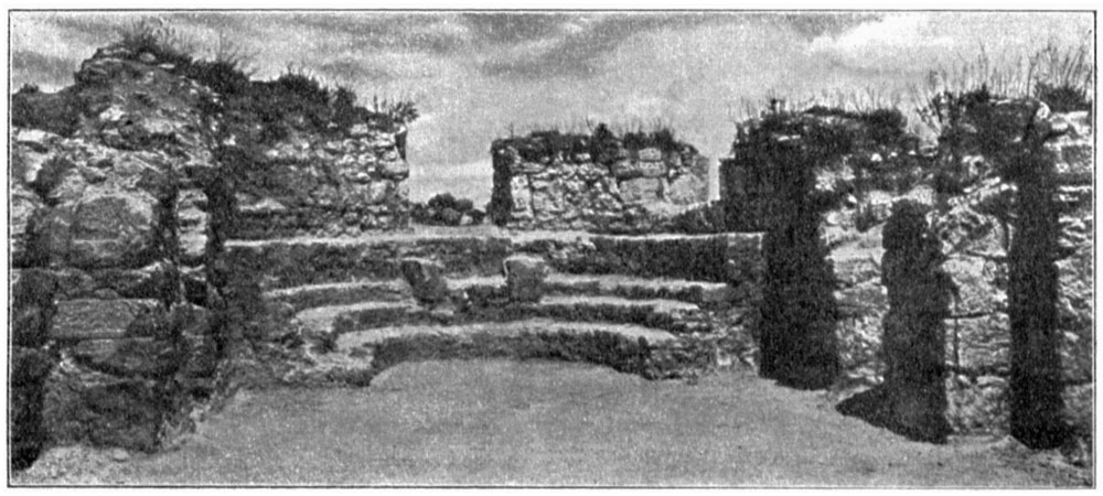 Расследование продолжалось по направлению к С.-В. и привело к открытию крестообразного купольного храма, в основных своих линиях превосходно сохранившегося (рис. 209) . С зап. стороны длинная узкая площадка впереди главного входа в храм была вымощена каменными плитами, которые покрывали также 3 усыпальницы (№№ 11-13), и часть водосточного