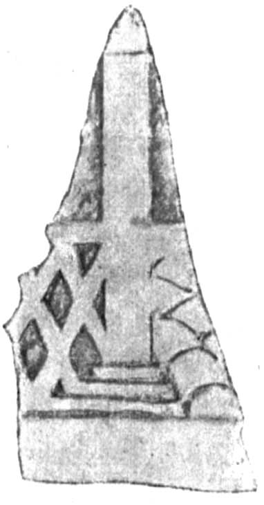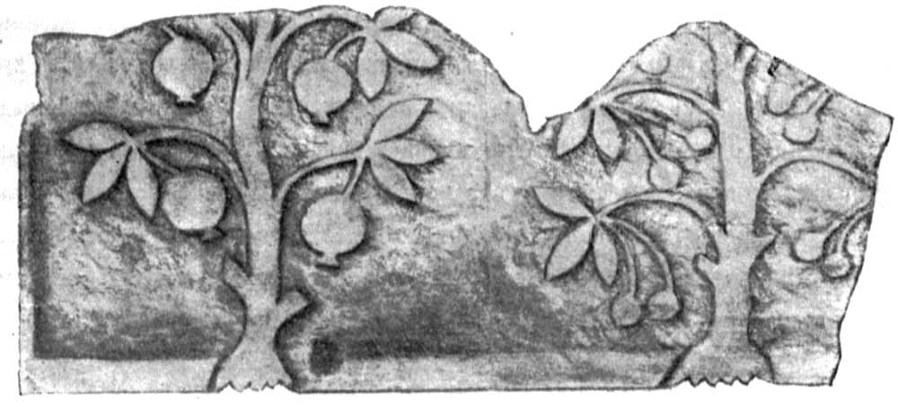 е) 3 обломка от мраморной плиты, в 0,01-0,02 м толщины, составляющие вместе один кусок в 0,42 м длины и 0,18 м высоты, со старательно исполненным рельефным изображением двух деревьев — гранатового и сливового — с плодами и с отпиленными двумя нижними ветками (рис. 218) . Деревья отполированы, фон же оставлен шероховатым. Снизу и с левой стороны плита сохранилась вполне, с правой стороны недостает 0,06 м, а сверху, судя по толщине излома, еще меньше. ж) 6 кусков от массивной арки, украшенных крестиком, розеткой и бордюром в античном стиле. з) Верхняя часть круглой, превосходно полированной колонны в 1,68 м длины, найденная снаружи храма. и) Капитель средней величины, поврежденная, с 24-мя круглыми углублениями в 0,02 м в диаметре. Найдена также снаружи храма, у двери II.