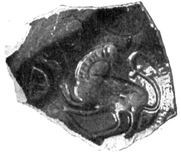 В среднем нефе у его начала, стена, сложенная из бутового камня без фундамента прямо на земле, отделяла квадратное помещение (5,5 х 5,5 м), служившее общей усыпальницей в поздневизантийскую эпоху. Здесь лежало в беспорядке огромное количество костей, между которыми найдены стеклянный детский браслет и половина бронз. энколпиона с рельефными изображениями Богородицы Оранты и четырех Евангелистов и с начальными буквами их имен (рис. 210) . Двери, первоначально оставленные в этой поперечной стене, были потом заложены, так что часть одной из двух массивных плит, прочно укрепленных на бетоне, оказалась под стеной, хотя более ранняя стена, в которой была устроена дверь, уже захватила левый карниз этой плиты.