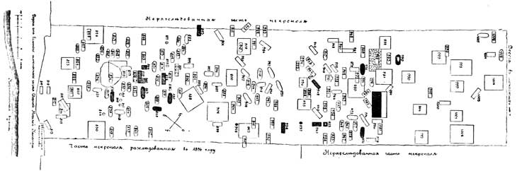 - Тоже (2,15 м дл., 1,4 м шир.), перегороженная плитами на две узкие гробницы, не покрытые и разграбленные. Помещалась сверху той же катакомбы.