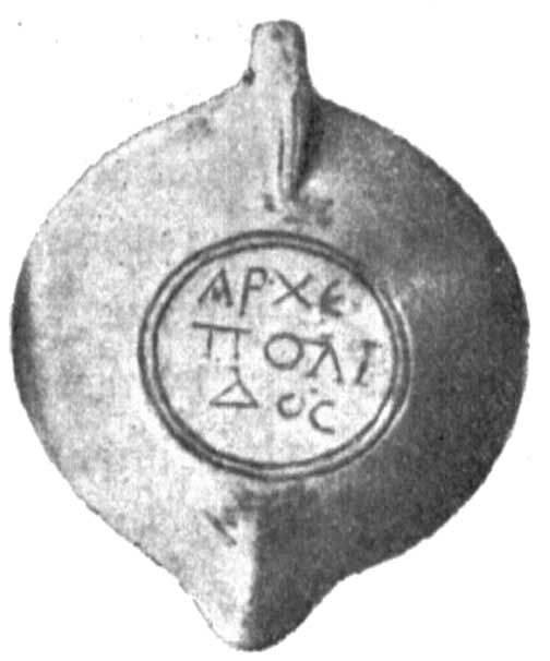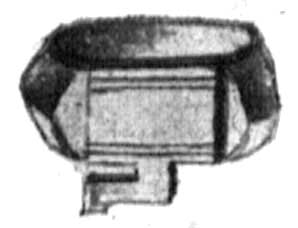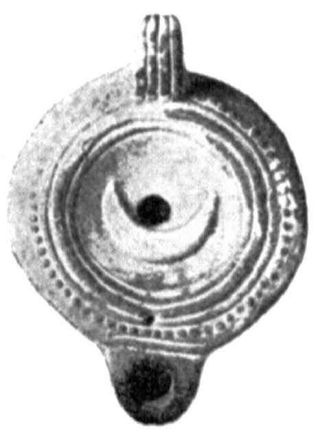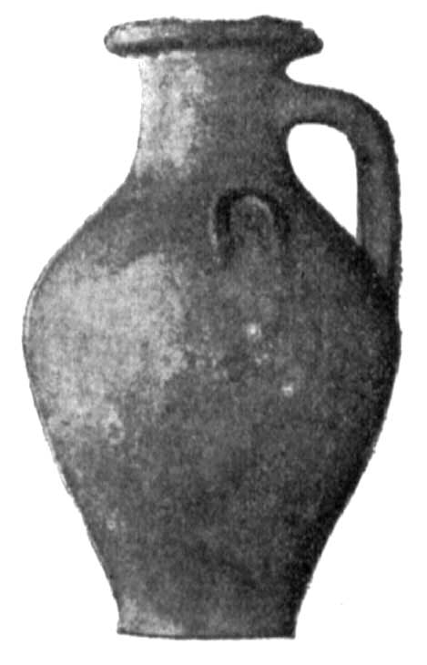 - Земляная гробница с жженым остовом. Глин. мисочка, в которой лежала глин. лампочка, с 2-мя расположенными одно против другого отверстиями для фитиля и с дугообразной ручкой сверху, как на корзинках
