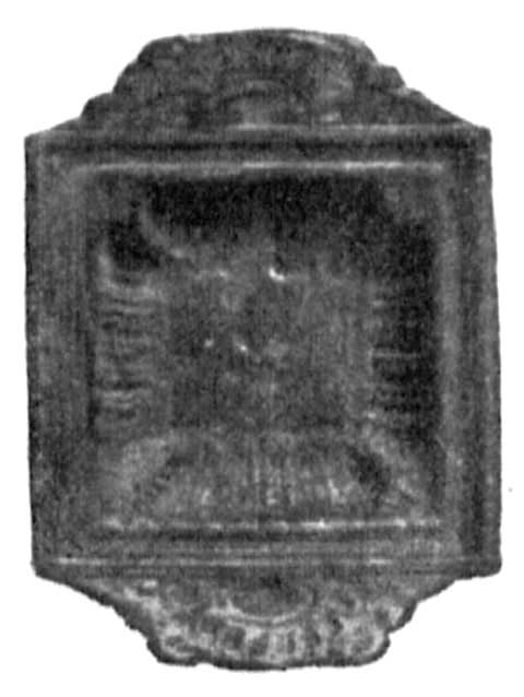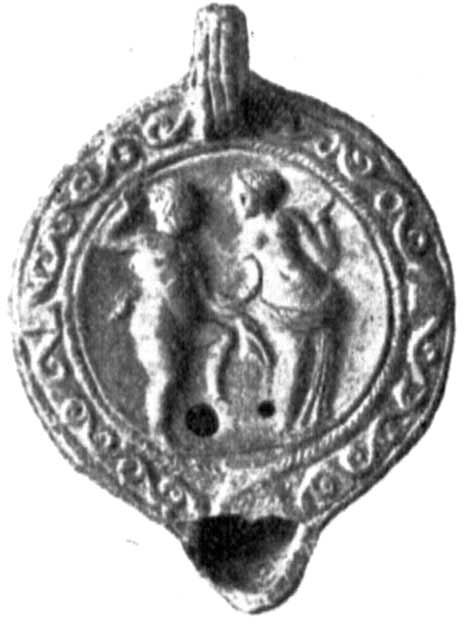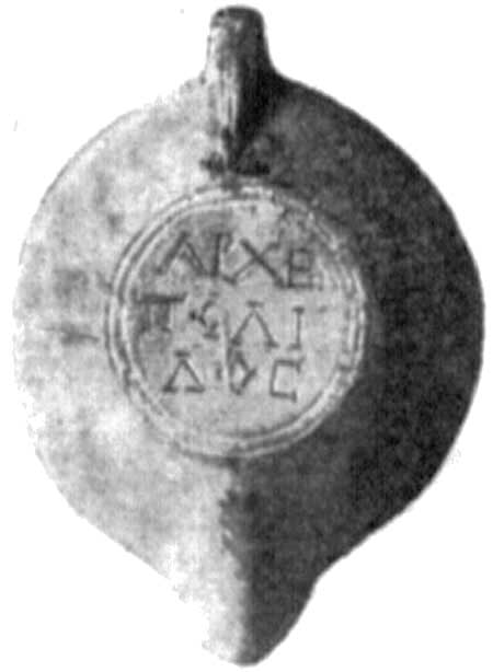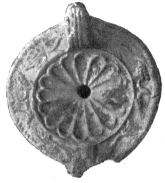 - верхняя часть глин. лампочки с рельефным изображением гладиатора с опущенным шлемом и с большим четырехугольным щитом, идущего вправо к стоящему кипарису