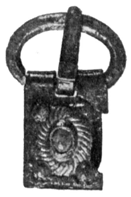 земле найдены: глин. лампочка с изображением бегущего вправо эрота, грубого исполнения, и разломанный оселок с дырочкой для ношения.