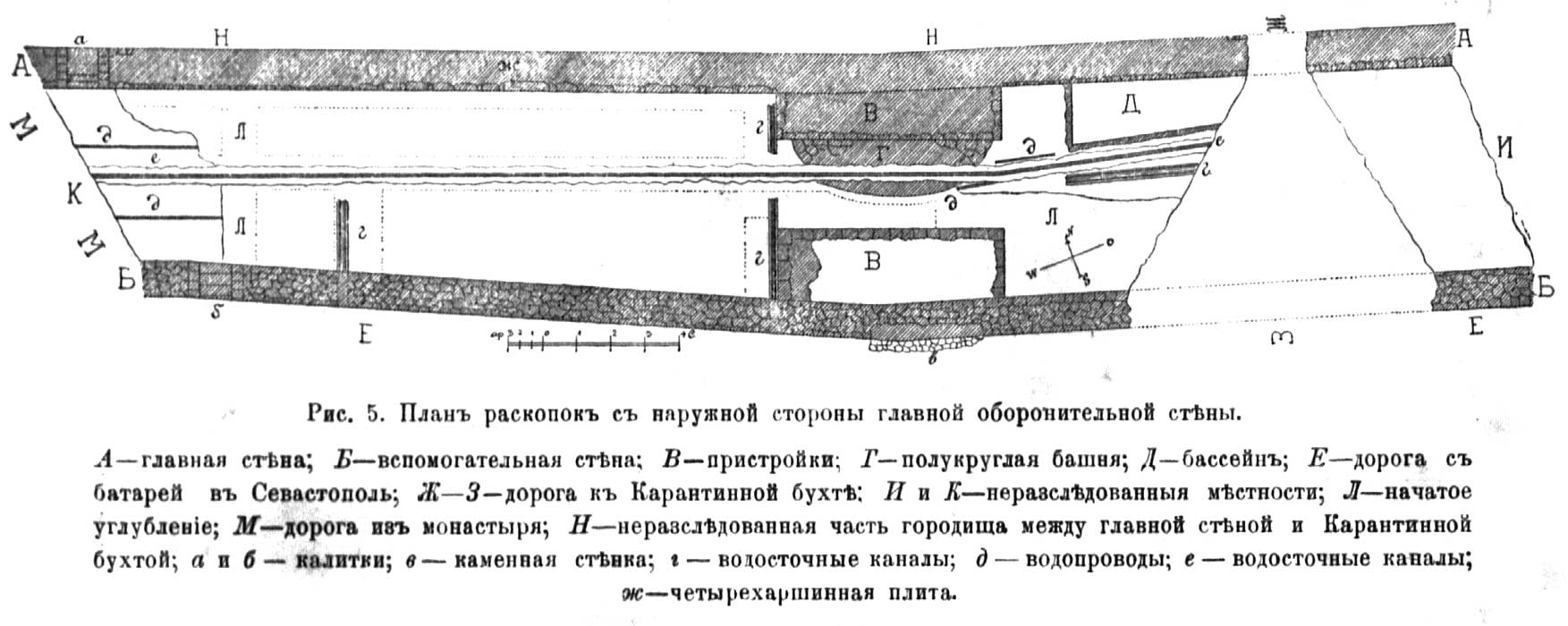Работы, которые велись одновременно дальше на северо-запад, между проломом, ведущим к складу древностей, и воротами монастыря, привели к результатам не менее важным. Г. Косцюшко-Валюжинич, продолжая здесь раскопки 1895 г. (см. выше), обнаружил, прежде всего, до уровня византийской эпохи пространство между главной и вспомогательной стенами, на протяжении около 75 м, и очистил контр-эскарп с внешней стороны на таком же расстоянии, причем в западном конце в обеих стенах оказалось по калитке (см. план с объяснением на рис. 5).