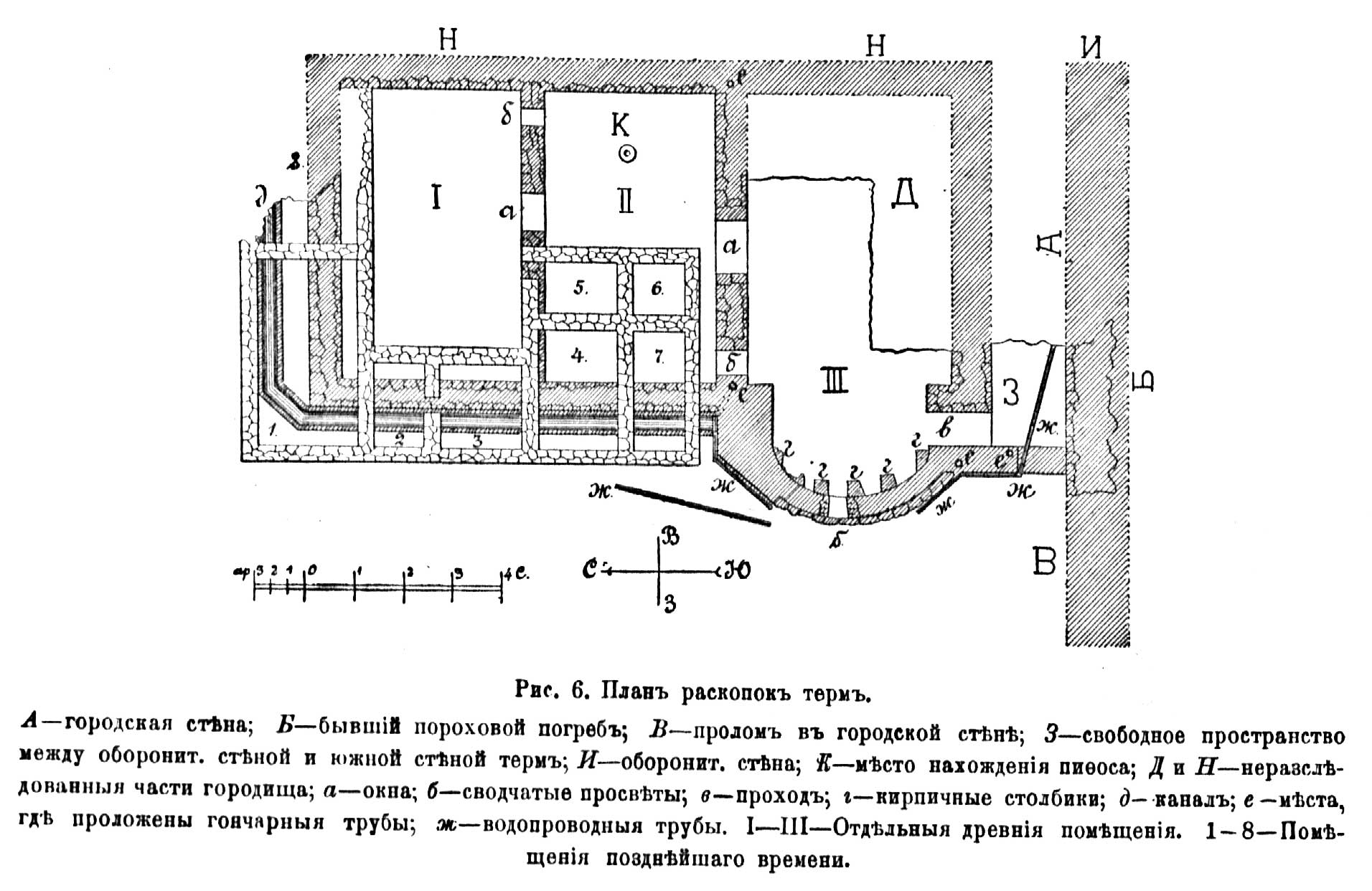 Помимо описанных раскопок, г. Косцюшко-Валюжинич исследовал еще местность с северной стороны порохового погреба, в виду того, что военное ведомство предполагало произвести здесь некоторые работы, грозившие остаткам старины уничтожением. Раскопки привели к открытию трех довольно обширных помещений, соединенных между собою широкими дверями и сводчатыми просветами (см. план с объяснением на рис. 6).