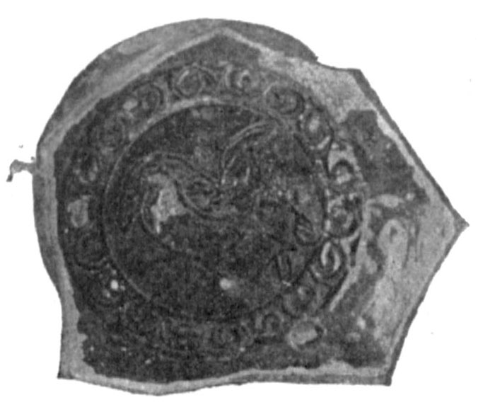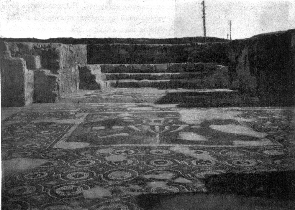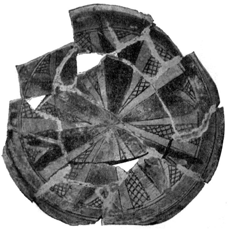 По всей вероятности, кое-как слепленные на глине скамьи горнего места (о которых упоминалось выше), происходят из того же времени, что и кирпичный пол алтаря. На месте престола в алтаре обнаружено обычное углубление для ковчега с мощами, выложенное мрамором. Найденная здесь же укрепленною на извести мраморная капитель (0,23 м выш. и 0,22 м диам. снизу) с выдолбленными сверху 11-ю дырочками (рис. 47) служила, вероятно, ставником для свечей в то время, когда первоначальный мраморный пол был заменен кирпичным, и когда было сооружено горнее место. Весь пол храма вплоть до мраморной солеи был покрыт прекрасною мозаикой (рис. 46) , которая по красоте рисунка превосходит все мозаики, найденные до сих пор в Херсонесе. Мозаика сделана из кубиков: 1) белого мрамора, признаваемого обыкновенно проконнесским, 2) красного мрамора из "Мраморной балки" близ Балаклавы, 3) черного песчаника из окрестностей Георгиевского монастыря и 4) желтого камня твердой породы, имеющегося в местности херсонесского городища. Для некоторых мелких деталей применены, кроме того, кусочки синего и зеленого камня или пасты. Обычных в херсонесских мозаиках кирпичных кубиков здесь не встречается. Рисунок мозаики в общих чертах следующий. В центре креста, образуемого полом храма, представлен двуручный канфар, из которого на стороны опускаются виноградные ветви; на них сидят два голубя, а по сторонам канфара стоят два павлина. Кругом центрального квадрата и по всей западной части пола представлены в медальонах, образуемых целою сетью переплетающихся жгутов, различные животные, плоды на ветках и в корзинах, кисти и листья винограда и плюща, раковины, сосуды, розетки, кресты; промежутки между медальонами заполнены квадратиками с шахматным узором. Северная часть пола украшена квадратиками и прямоугольниками, заполненными разнообразными геометрическими орнаментами. В южной части пола посередине видим вазу, на которой сидят два голубка; из вазы выходят на стороны виноградные ветви. Ваза находится в медальоне, образуемом переплетающимися жгутами, которые продолжаются далее и заключают медальон в четырехугольную раму. В треугольниках по четырем углам квадрата изображены стилизованные канфары. Весь пол по краям обрамлен виноградными ветвями, выходящими из двух ваз, изображенных у северного и южного концов солеи. При раскопках с внутренней и с наружной стороны алтарной части храма собрано значительное количество кусочков мозаики (преимущественно синей и голубой), которая, по всей вероятности, украшала потолок алтаря. Стены храма были украшены фресками, которые несколько раз подновлялись. Фрески, принадлежащие древнейшим слоям, выгодно отличаются по качествам от позднейших. Фрески найдены in situ в двух местах: 1) внутри заплечика, образуемого южной стеной западной части креста и западной стеной его южной части и 2) на восточной стене северной части креста, начиная от угла, обращенного к алтарю. Первая фреска изображала двух святых, стоящих по обеим сторонам угла, сохранились лишь нижние части фигур (рис. 48) . Уцелели надписи, бывшие сбоку у изображений. Греческая надпись [3] представляет текст начала псалма 34: ![]() Позднейшее армянское graffito, по переводу проф. Н.Я. Марра, гласит: "Тот, кто [сделал] Богу это в храме, есть Мхитар, раб Бога" [4] . На другой фреске изображены были трое святых; с правой 