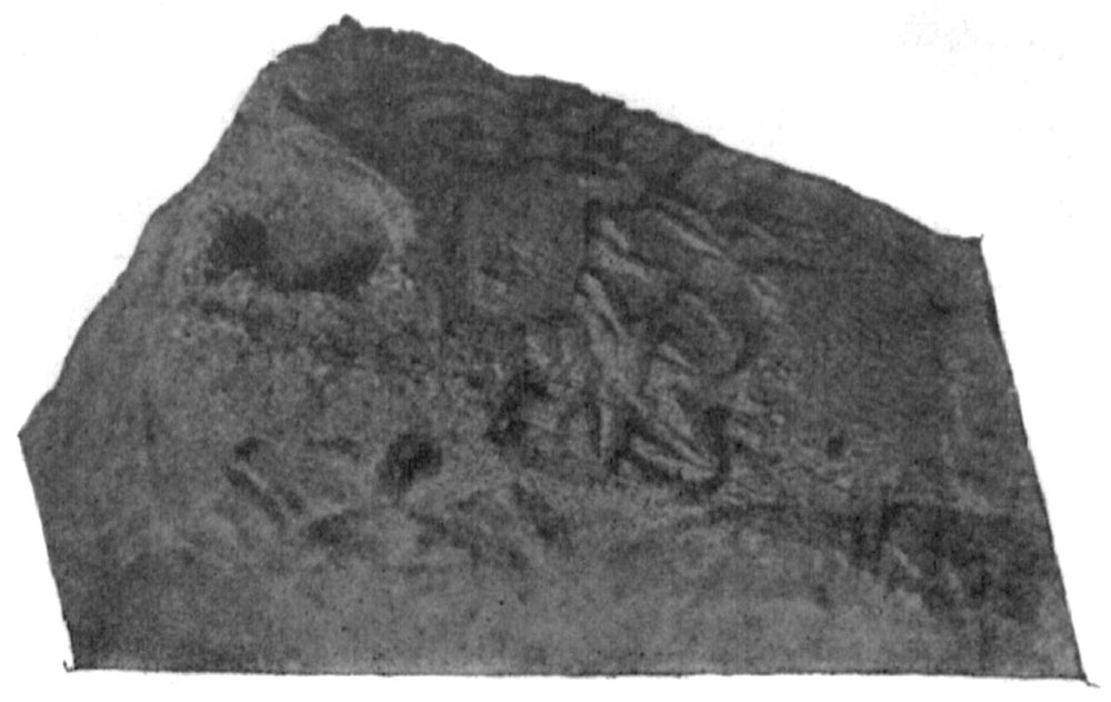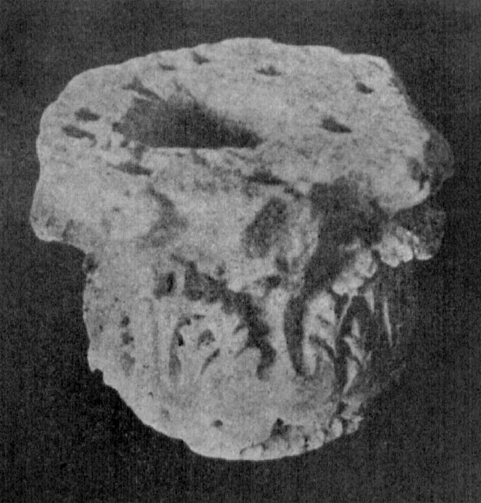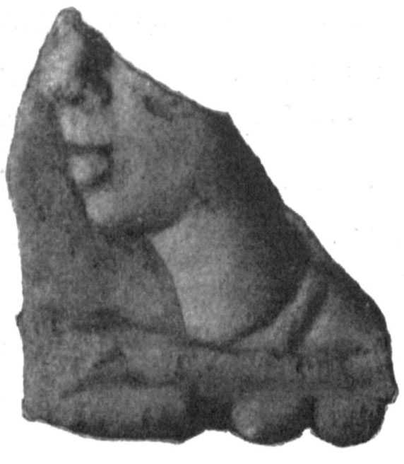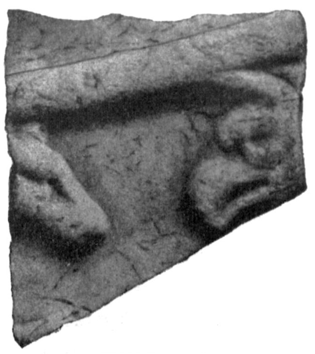 С наружной стороны храма при раскопках найдены: обломки мраморных и известковых плит с надписями [9] , обломки мраморного рельефного образа (рис. 58) , различные монеты [10] , обломки мраморных изваяний, обломки различной посуды, принадлежности хозяйства, рыболовства, архитектурные обломки. Интересно днище поливного сосуда с выдавленным изображением птицы, клюющей змею (рис. 59) , и