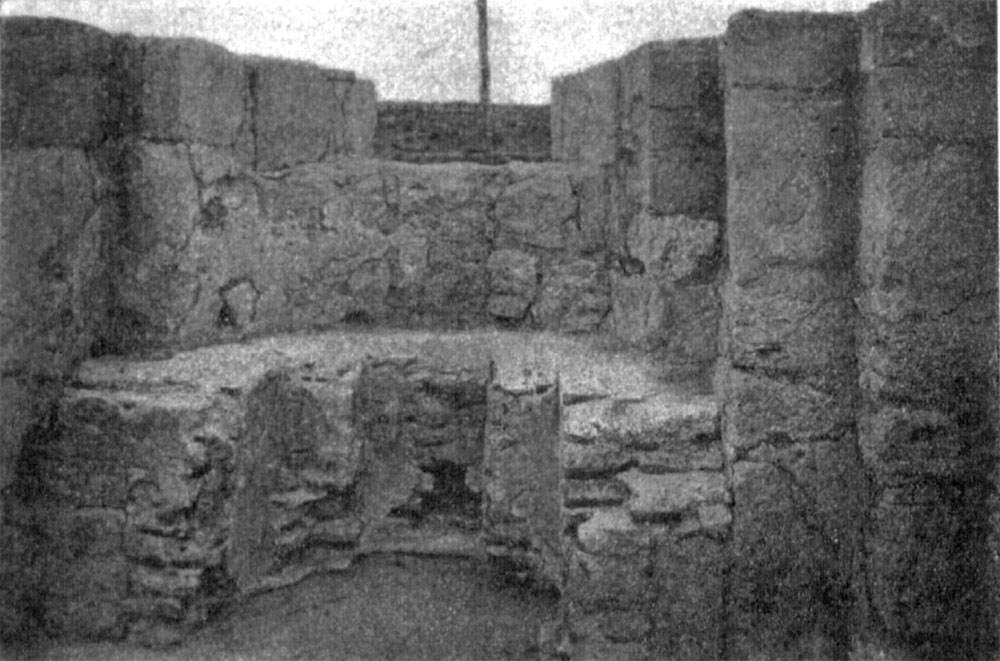 С разных сторон у храма найдены несомненно позднейшие пристройки. С южной стороны алтаря пристроена небольшая часовня с полукруглою апсидой (рис. 49 и 50 ) . В крестообразном бассейне, который был выложен мрамором, под одной из плит найдено 26 византийских монет (наиболее поздние — Юстиниана I). Вода проходила сюда по трубе сквозь стену из небольшого резервуара снаружи. В часовне было два окна, одно над бассейном, другое в южной стене. Дверь, ведшая первоначально из алтаря