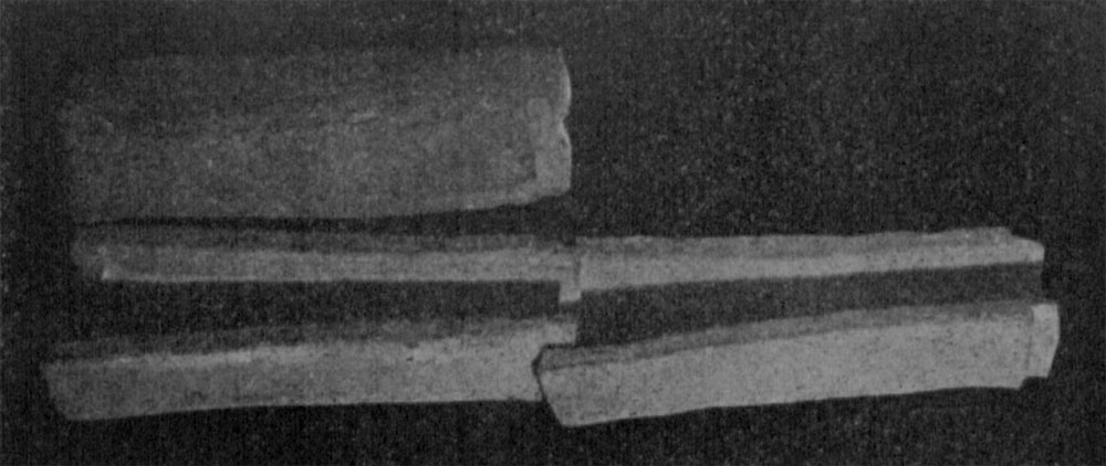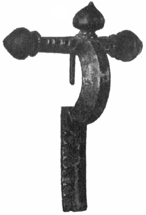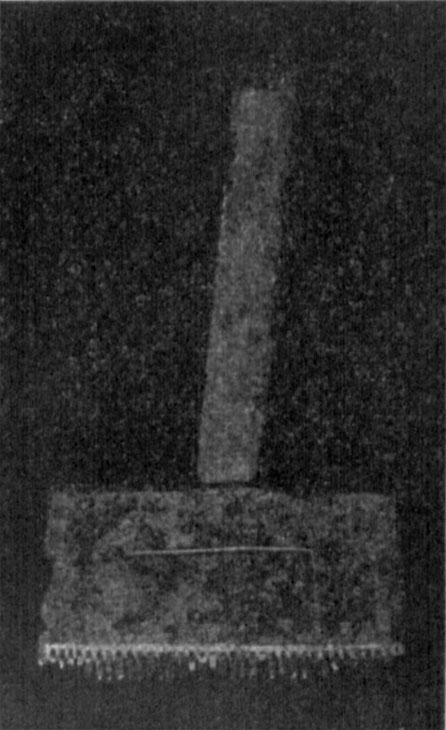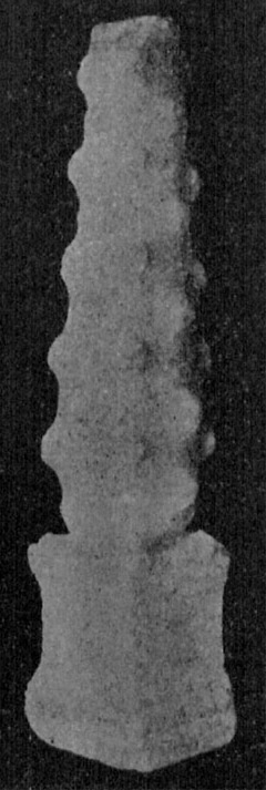 С северной стороны к алтарю примыкают пристройки Е, Е', Е" (рис. 52) , которые К.К. Косцюшко-Валюжинич считает жилыми помещениями. В помещении Е пол был сделан из каменных плит. В Е" сохранилось небольшое отделение прямоугольной формы, наподобие пашенной ямы; тонкие стенки его сложены из кирпича. К помещению Е" с юга примыкает часовня Б (рис. 53) , апсида которой выступает из восточной стены ограды. Судя по уцелевшим четырем столбам, часовня, вероятно, была перекрыта круглым сводом. В алтарной апсиде устроено пять ниш, служивших сидениями для духовенства, вместо обычных в Херсонесе каменных скамеек. Порог образует мраморный брус с вырезанным на нем крестом. В часовне найден мраморный прямоугольный пьедестал с утвержденной на нем палицей Геракла (рис. 54) ; в христианское время этот предмет мог служить ставником для свечей, подобно упомянутой выше коринфской капители. С южной и западной сторон храма открыты следы позднейших стен м. Слева от западной входной двери храма найдена принадлежащая также позднейшим временам мраморная база л. Внутри храма, в южном конце креста по мозаике прошла позднейшая стена м. К позднейшим временам относятся и найденные в храме могилы №№1407 и 1408, при сооружении которых частью разрушен был роскошный мозаичный пол храма. Среди плит, покрывавших эти могилы, оказались части каменной коробки от западных дверей храма. В северной стене храма ниже мозаичного пола проходит гончарная труба в 0,12 м диам. у выхода из стены.