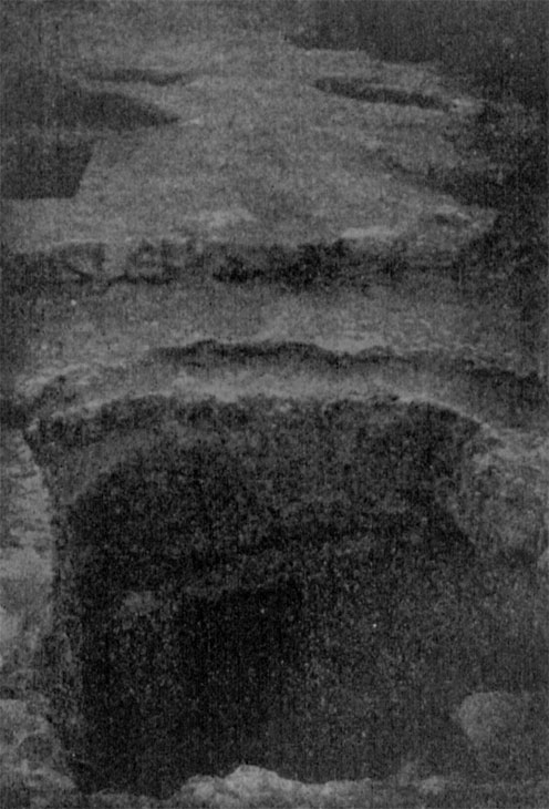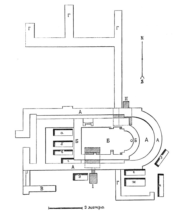 Крестообразный небольшой храм с окружающими его постройками занимает площадь в 1278 кв. метров [2] . Храм окружала ограда (В), сделанная частью из камня и частью из кирпича: это указывает, что ограда была значительной высоты. Ограда не сохранилась целиком; по остаткам ее, однако, можно точно определить ее первоначальное направление. Остатки ворот в с.-з. части ограды относятся к позднейшему времени: они выстроены на насыпи, образовавшейся после разрушения более древнего храма, к которому вела прекрасная, вымощенная щебнем и известью дорога. Эта дорога лежит значительно ниже с.-з. ворот. Направление дороги от храма к городищу было, по-видимому, то же, что у нынешней дороги к монастырю мимо пороховых погребов. Сквозь ограду проходят несколько водостоков: 1) к на плане, 2) водосток, находящийся к В. от к, и 3) водосток у базилики Б, находящийся над склепом №1446. Находящийся в центре двора, окруженного оградою, храм (А) в плане имеет форму равностороннего креста. В храм первоначально вели четыре двери (с В., З., Ю. и С.): позднее восточная, южная и северная двери были упразднены. В восточной части храма было сооружено впоследствии горнее место (рис. 46) .