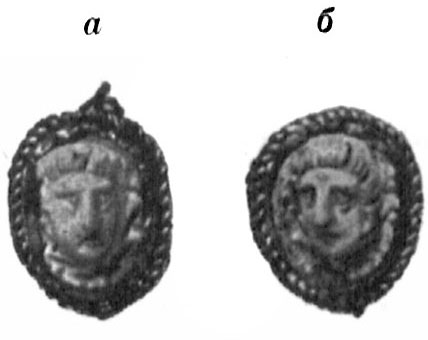Предметы из серебра. Два медальона с камеями из голубоватой прослойки агата на черном фоне (рис. 74) ; два массивные перстня приплюснутой формы с сердоликами, на которых резные изображения льва, нападающего на оленя, и грифона, прыгающего влево (мог. 1204); перстень с сердоликом, на котором вырезан бегущий влево лев (1227); простые перстни, браслеты, серьги, копоушки, пряжки, крестик.