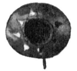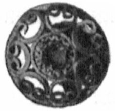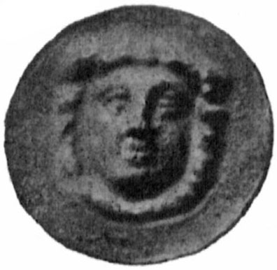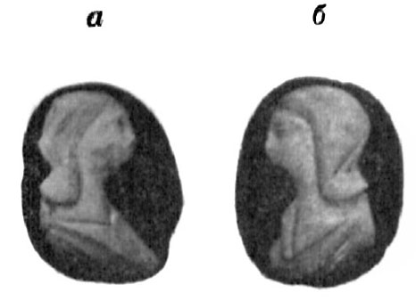 Предметы из железа. Перстни, ножи (на одном сохранились остатки кожаного футляра), ключ, крестик, принадлежности сбруи. Посуда. Сосуды чернолаковые, краснолаковые, простые глиняные, светильники, из коих некоторые украшены рельефами, стеклянные сосуды. Весьма интересен белый стеклянный флакон (мог. 1386) в виде женской головки (рис. 77а) ; на дне его снаружи оттиснута тоже женская головка (рис. рис. 77б с гипс. слепка).